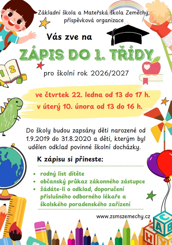 Zápis do 1. třídy se uskuteční ve čtvrtek 22. ledna 2026 od 13:00 do 17:00 a v úterý 10. února 2026 od 13 do 16 hodin.