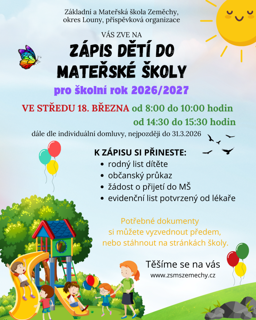 Základní a Mateřská škola Zeměchy, okres Louny, vás srdečně zve na zápis do mateřské školy pro školní rok 2026/2027. Zápis se uskuteční ve středu 18. března 2026 od 8:00 do 10:00 hodin a od 14:30 do 15:30 hodin.